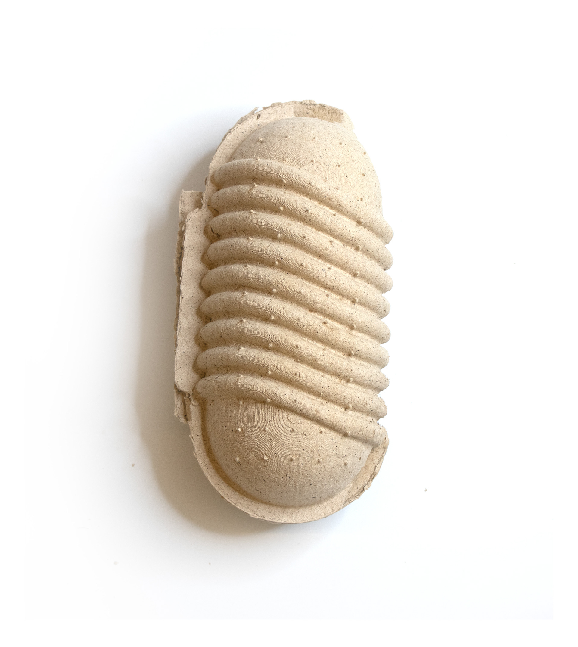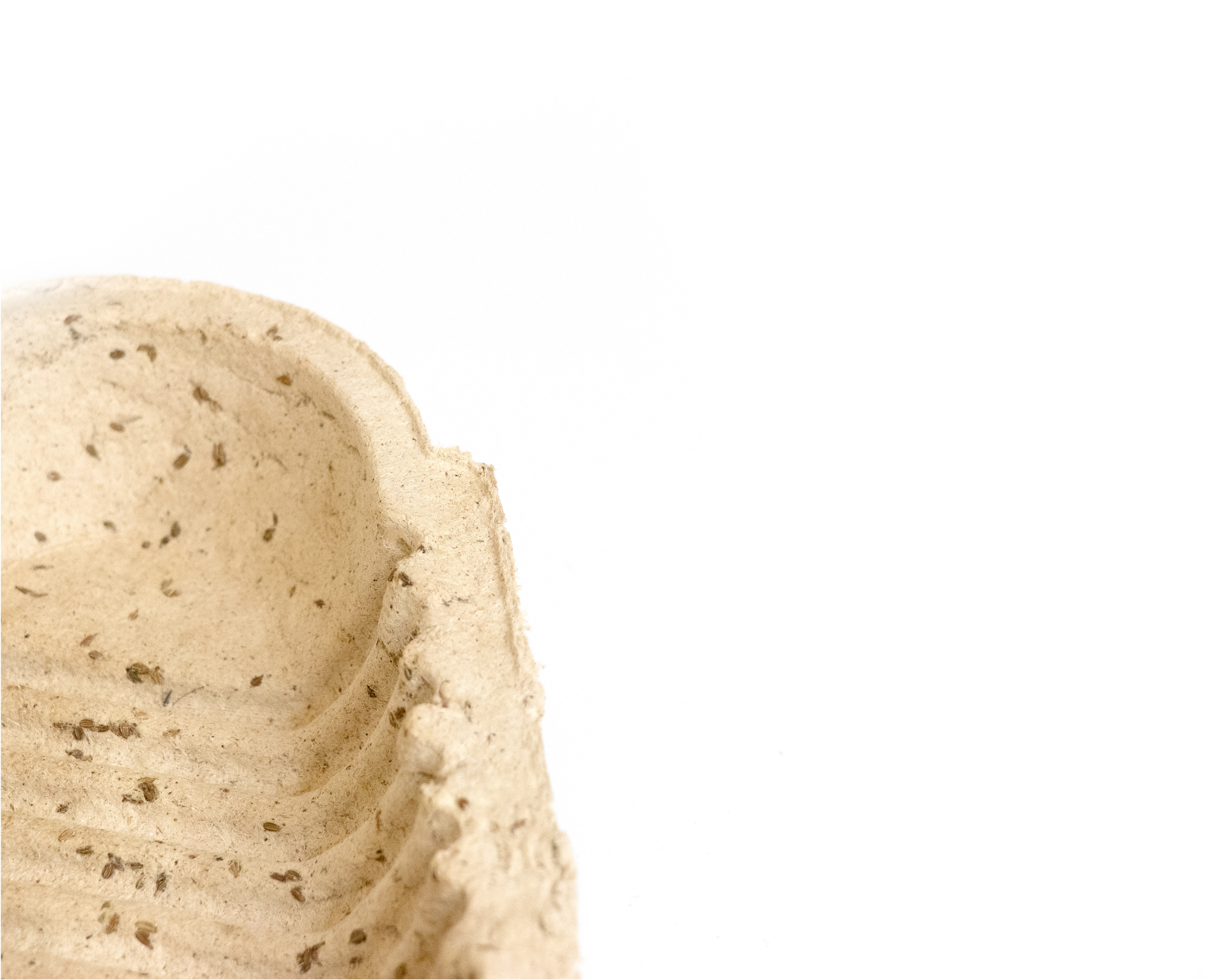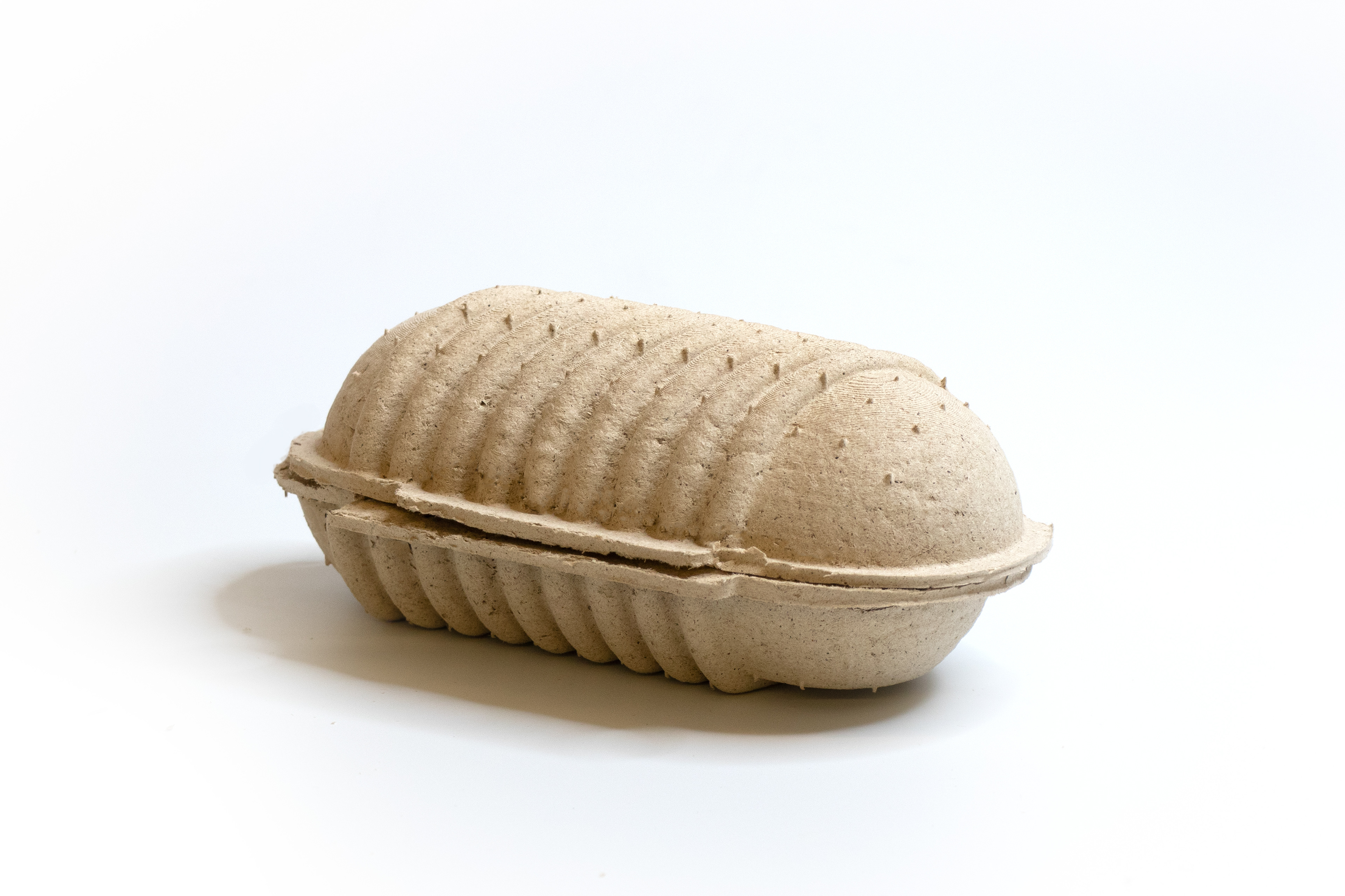 Seed Shell was created with a 3-part 3D printed mold consisting of a wall, positive, and negative piece. The packaging is made from willow pulp, bound together by rice paste, a biodegradable binding element, and vegetable seeds.